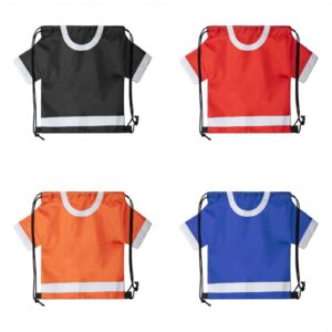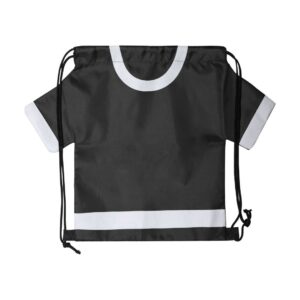 Original y divertida mochila de cuerdas para adulto en forma de camiseta. En suave poliéster 210D, con cuerdas autocierre en color negro y esquinas reforzadas.