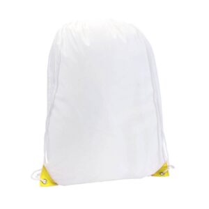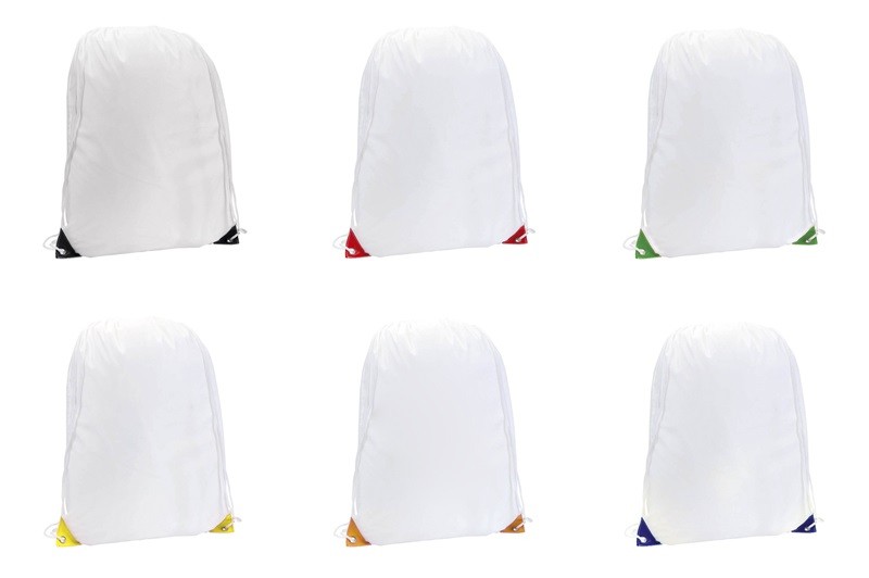 Mochila de cuerdas en suave poliéster 210T de color blanco con esquinas en alegres colores. Con cuerdas autocierre en color blanco y esquinas con argollas metálicas y refuerzo de polipiel.