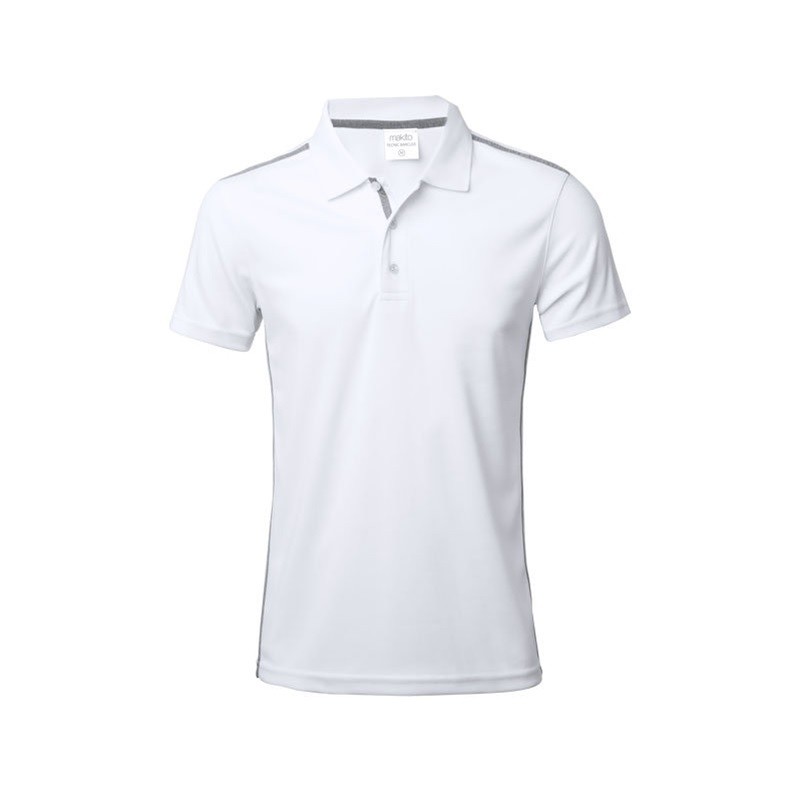 Polo técnico para adulto en poliéster transpirable de 180g/m2. De elegante diseño bicolor, en color blanco con contraste de detalles en gris.