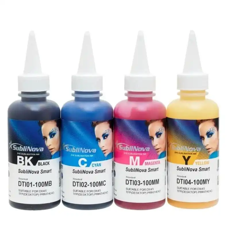 Tinta para SUBLIMACION, PACK 4 Botellas de 100ml color NEGRO, CIAN, MAGENTA y AMARILLO para impresoras de inyección de tinta A3 y A4 piezoeléctricas Epson, Brother y plotters Roland, Mimaki, Mutoh y Epson con cabezales DX4 y DX5.